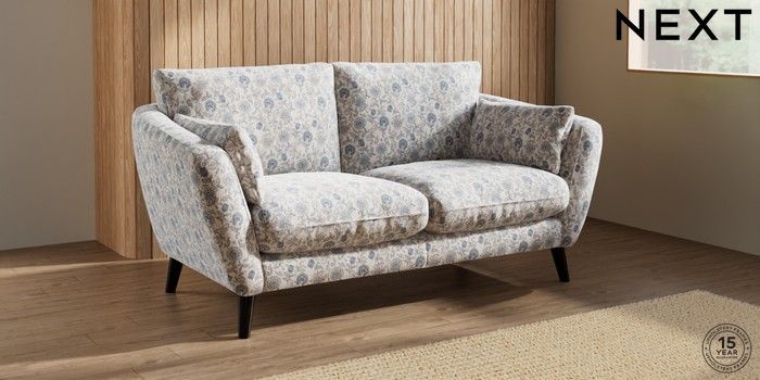 7.3.1 Buy Orlo Relaxed Sit 3 Seater Small Sofa Relaxed Linen Look Print Woodblock Floral Blue Retro Tapered - Dark from the Seasons online shop