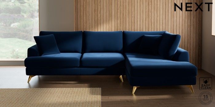 7.3.1 Buy Parker Large Corner Chaise - Right Hand Plush Velvet Easy Clean Navy Blue High Metal - Brass from the Seasons online shop