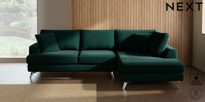 7.3.1 Buy Parker Medium Corner Chaise - Right Hand Plush Velvet Easy Clean Bottle Green High Metal - Chrome from the Seasons online shop Click here to use our website with more accessibility support, for example screen readers