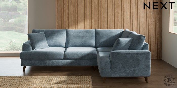 7.2.10 Buy Parker Medium Corner Sofa - Right Hand Plush Chenille Light Blue Low Retro Tapered - Mid from the Seasons online shop Click here to use our website with more accessibility support, for example screen readers