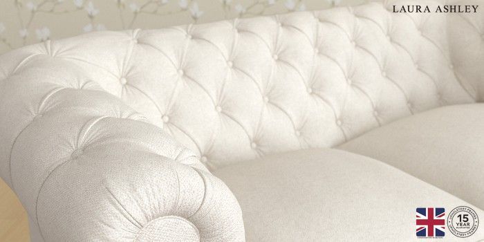 The Laura Ashley Penarth is a signature deep sit curved sofa in the Chesterfield style. Featuring gently scrolled, wide arms, matching the height of the back of the sofa, combined with deep seat cushions filled with foam core and fibre wrap interiors, this sofa is perfect for relaxing in. Elegant, tapered show wood legs with brass or chrome castors complete the traditional, classic style.