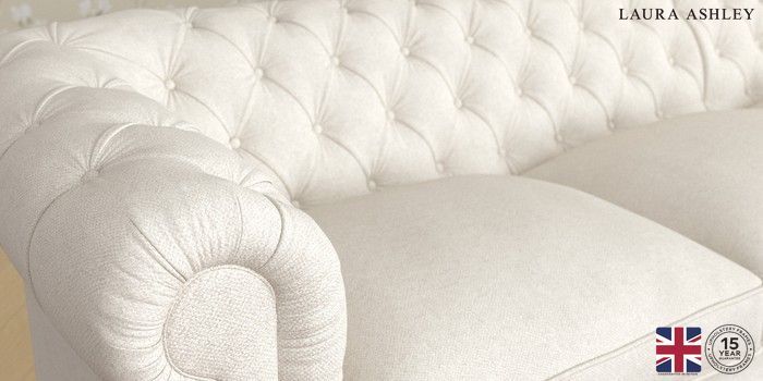 The Laura Ashley Penarth is a signature deep sit curved sofa in the Chesterfield style. Featuring gently scrolled, wide arms, matching the height of the back of the sofa, combined with deep seat cushions filled with foam core and fibre wrap interiors, this sofa is perfect for relaxing in. Elegant, tapered show wood legs with brass or chrome castors complete the traditional, classic style.