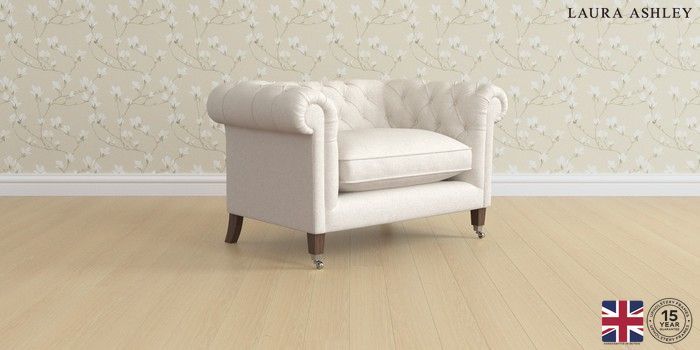 The Laura Ashley Penarth is a signature deep sit curved sofa in the Chesterfield style. Featuring gently scrolled, wide arms, matching the height of the back of the sofa, combined with deep seat cushions filled with foam core and fibre wrap interiors, this sofa is perfect for relaxing in. Elegant, tapered show wood legs with brass or chrome castors complete the traditional, classic style.