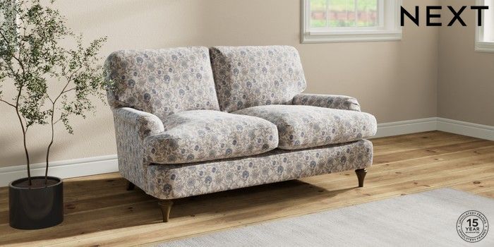 7.3.1 Buy Sadie Deep Relaxed Sit 2 Seater Small Sofa Relaxed Linen Look Print Woodblock Floral Blue High Slim Turned - Mid from the Seasons online shop