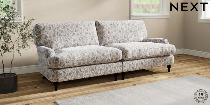 7.3.1 Buy Sadie Deep Relaxed Sit 4 Seater Sofa Relaxed Linen Look Print Woodblock Floral Blue High Slim Turned - Dark from the Seasons online shop