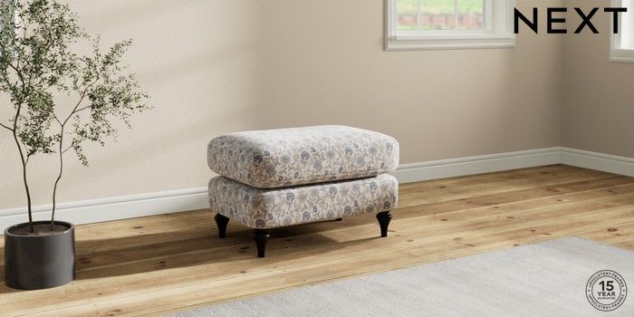 7.3.1 Buy Sadie Deep Relaxed Sit Footstool Relaxed Linen Look Print Woodblock Floral Blue High Slim Turned - Dark from the Seasons online shop