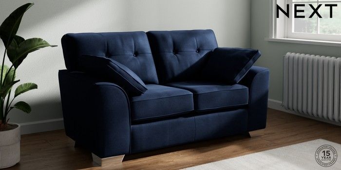 7.2.10 Buy Stamford Buttoned Back 2 Seater Small Sofa Luxe Chenille Navy Blue Large Square Angle - Chrome Metal from the Seasons online shop Click here to use our website with more accessibility support, for example screen readers