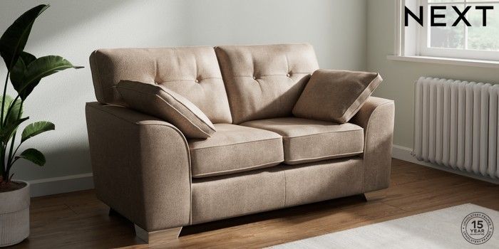 7.2.10 Buy Stamford Buttoned Back 2 Seater Small Sofa Plush Chenille Mid Natural Large Square Angle - Chrome Metal from the Seasons online shop Click here to use our website with more accessibility support, for example screen readers