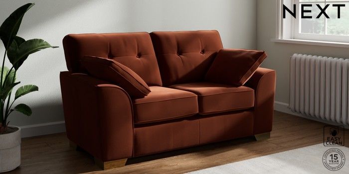7.3.1 Buy Stamford Buttoned Back 2 Seater Small Sofa Plush Velvet Easy Clean Ginger Orange Large Square Angle - Brushed Brass from the Seasons online shop Click here to use our website with more accessibility support, for example screen readers