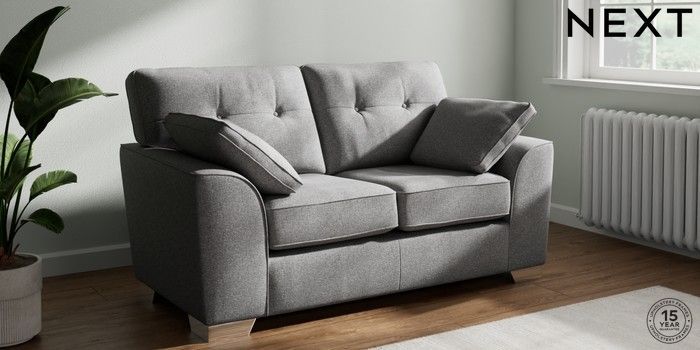7.2.10 Buy Stamford Buttoned Back 2 Seater Small Sofa Studio Chenille Mid Grey Large Square Angle - Chrome Metal from the Seasons online shop Click here to use our website with more accessibility support, for example screen readers