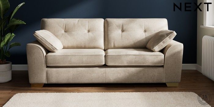 7.2.10 Buy Stamford Buttoned Back 3 Seater Sofa Plush Chenille Light Natural Large Square Angle - Brushed Brass from the Seasons online shop Click here to use our website with more accessibility support, for example screen readers