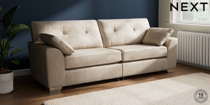 7.2.10 Buy Stamford Buttoned Back 4 Seater Sofa Plush Chenille Light Natural Large Square Angle - Chrome Metal from the Seasons online shop Click here to use our website with more accessibility support, for example screen readers