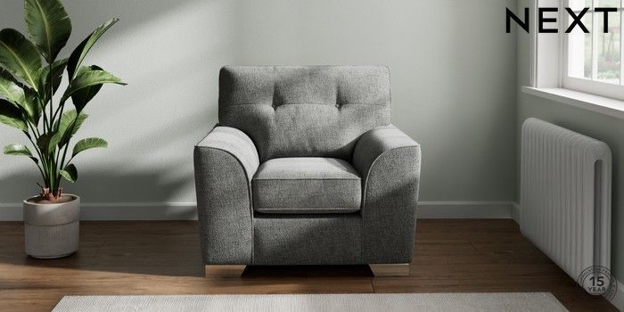 7.2.10 Buy Stamford Buttoned Back Armchair Chunky Chenille Dark Grey Square Angle - Chrome Metal from the Seasons online shop Click here to use our website with more accessibility support, for example screen readers