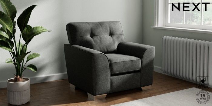 7.3.1 Buy Stamford Buttoned Back Armchair Tweedy Blend Easy Clean Charcoal Grey Square Angle - Chrome Metal from the Seasons online shop Click here to use our website with more accessibility support, for example screen readers