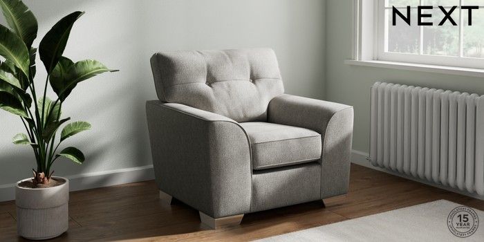 7.3.1 Buy Stamford Buttoned Back Armchair Tweedy Chenille Mid Grey Square Angle - Chrome Metal from the Seasons online shop Click here to use our website with more accessibility support, for example screen readers