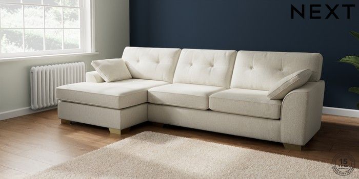7.2.10 Buy Stamford Buttoned Back Large Sofa Chaise - Left Hand Chunky Texture Oyster Large Square Angle - Brushed Brass from the Seasons online shop Click here to use our website with more accessibility support, for example screen readers