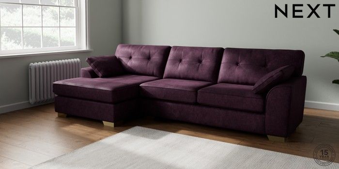 7.3.1 Buy Stamford Buttoned Back Large Sofa Chaise - Left Hand Plush Chenille Dark Plum Purple Large Square Angle - Brushed Brass from the Seasons online shop Click here to use our website with more accessibility support, for example screen readers