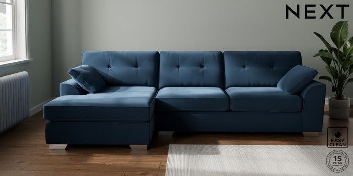 7.3.1 Buy Stamford Buttoned Back Large Sofa Chaise - Left Hand Plush Velvet Easy Clean Airforce Blue Large Square Angle - Chrome Metal from the Seasons online shop Click here to use our website with more accessibility support, for example screen readers