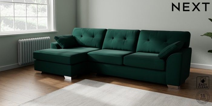 7.3.1 Buy Stamford Buttoned Back Large Sofa Chaise - Left Hand Plush Velvet Easy Clean Bottle Green Large Square Angle - Chrome Metal from the Seasons online shop Click here to use our website with more accessibility support, for example screen readers