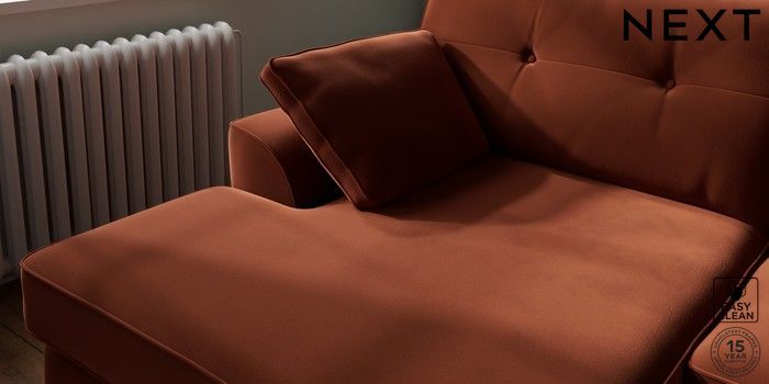7.3.1 Buy Stamford Buttoned Back Large Sofa Chaise - Left Hand Plush Velvet Easy Clean Ginger Orange Large Square Angle - Brushed Brass from the Seasons online shop Click here to use our website with more accessibility support, for example screen readers