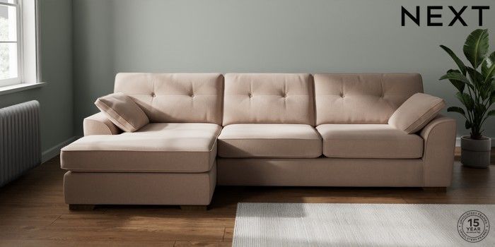 7.2.10 Buy Stamford Buttoned Back Large Sofa Chaise - Left Hand Relaxed Linen Look Mid Natural Large Square Angle - Mid from the Seasons online shop Click here to use our website with more accessibility support, for example screen readers