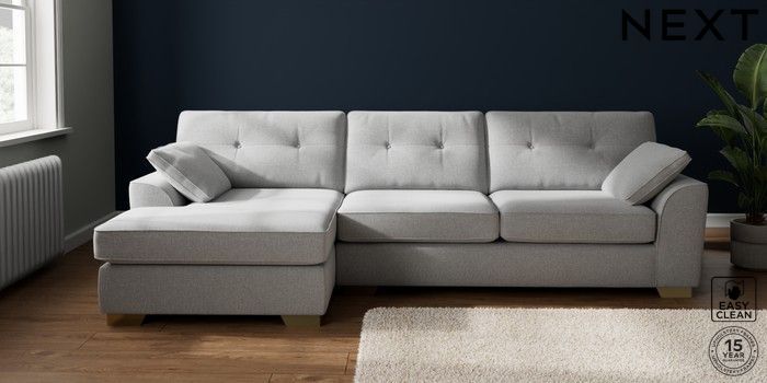 7.2.10 Buy Stamford Buttoned Back Large Sofa Chaise - Left Hand Tweedy Blend Easy Clean Light Silver Grey Large Square Angle - Brushed Brass from the Seasons online shop Click here to use our website with more accessibility support, for example screen readers
