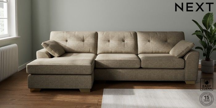 7.2.10 Buy Stamford Buttoned Back Large Sofa Chaise - Left Hand Woven Chenille Easy Clean Mid Natural Large Square Angle - Brushed Brass from the Seasons online shop Click here to use our website with more accessibility support, for example screen readers