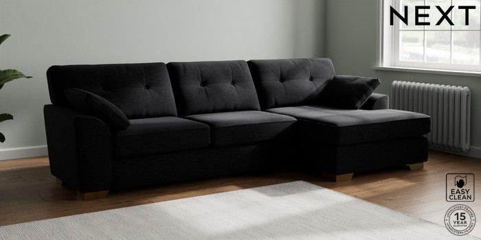 7.2.10 Buy Stamford Buttoned Back Large Sofa Chaise - Right Hand Fine Chenille Easy Clean Black Large Square Angle - Brushed Brass from the Seasons online shop Click here to use our website with more accessibility support, for example screen readers