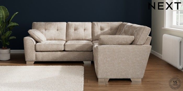7.2.10 Buy Stamford Buttoned Back Medium Corner Sofa - Universal Distressed Velour Mid Natural Large Square Angle - Chrome Metal from the Seasons online shop Click here to use our website with more accessibility support, for example screen readers