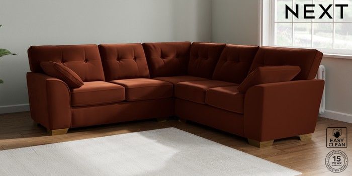 7.2.10 Buy Stamford Buttoned Back Medium Corner Sofa - Universal Plush Velvet Easy Clean Ginger Orange Large Square Angle - Brushed Brass from the Seasons online shop Click here to use our website with more accessibility support, for example screen readers