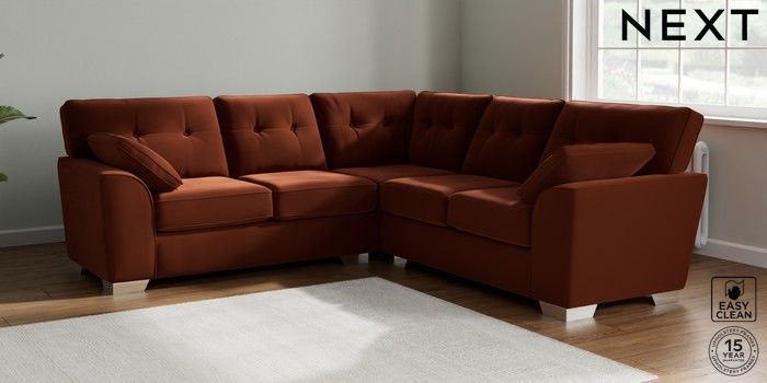 7.2.10 Buy Stamford Buttoned Back Medium Corner Sofa - Universal Plush Velvet Easy Clean Ginger Orange Large Square Angle - Chrome Metal from the Seasons online shop Click here to use our website with more accessibility support, for example screen readers