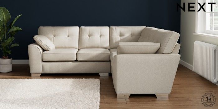 7.2.10 Buy Stamford Buttoned Back Medium Corner Sofa - Universal Tweedy Chenille Oyster Large Square Angle - Chrome Metal from the Seasons online shop Click here to use our website with more accessibility support, for example screen readers