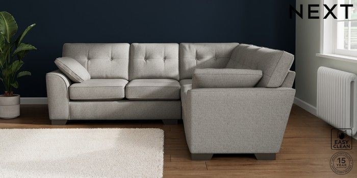 7.2.10 Buy Stamford Buttoned Back Medium Corner Sofa - Universal Woven Chenille Easy Clean Light Grey Large Square Angle - Gunmetal from the Seasons online shop Click here to use our website with more accessibility support, for example screen readers