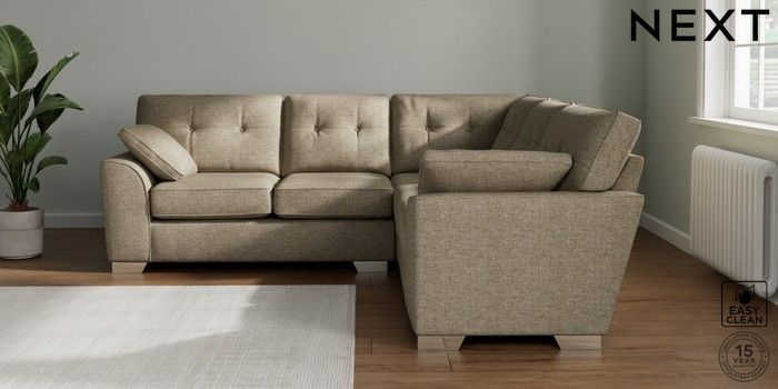 7.2.10 Buy Stamford Buttoned Back Medium Corner Sofa - Universal Woven Chenille Easy Clean Mid Natural Large Square Angle - Chrome Metal from the Seasons online shop Click here to use our website with more accessibility support, for example screen readers