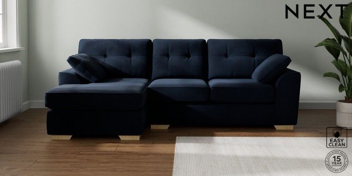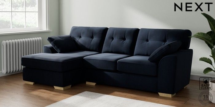 7.2.10 Buy Stamford Buttoned Back Medium Sofa Chaise - Left Hand Fine Chenille Easy Clean Dark Navy Blue Large Square Angle - Light from the Seasons online shop Click here to use our website with more accessibility support, for example screen readers