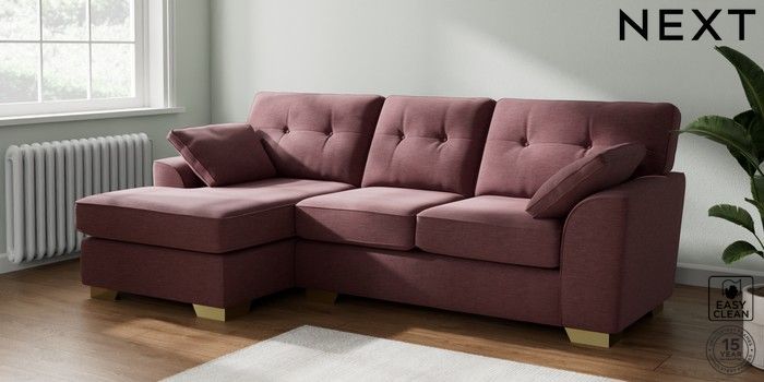7.3.1 Buy Stamford Buttoned Back Medium Sofa Chaise - Left Hand Fine Chenille Easy Clean Mid Mulberry Purple Large Square Angle - Brushed Brass from the Seasons online shop Click here to use our website with more accessibility support, for example screen readers