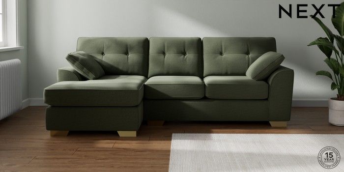 7.2.10 Buy Stamford Buttoned Back Medium Sofa Chaise - Left Hand Relaxed Linen Look Dark Green Large Square Angle - Brushed Brass from the Seasons online shop Click here to use our website with more accessibility support, for example screen readers