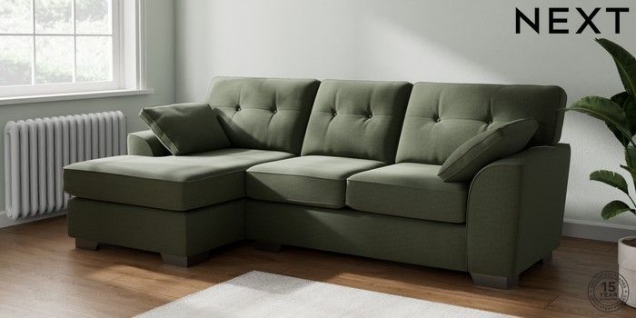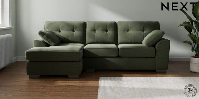 7.3.1 Buy Stamford Buttoned Back Medium Sofa Chaise - Left Hand Relaxed Linen Look Dark Green Large Square Angle - Gunmetal from the Seasons online shop Click here to use our website with more accessibility support, for example screen readers