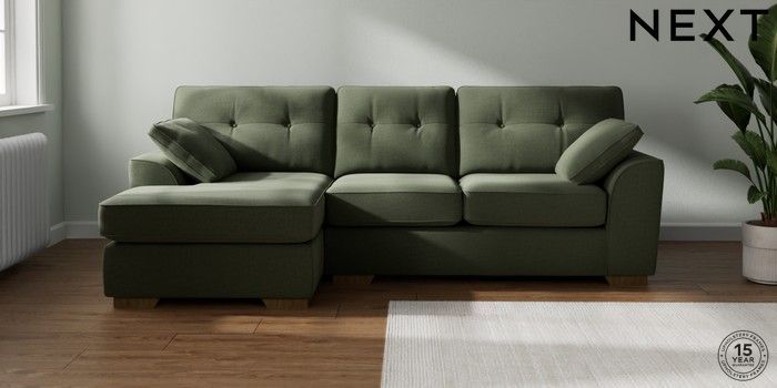 7.2.10 Buy Stamford Buttoned Back Medium Sofa Chaise - Left Hand Relaxed Linen Look Dark Green Large Square Angle - Mid from the Seasons online shop Click here to use our website with more accessibility support, for example screen readers