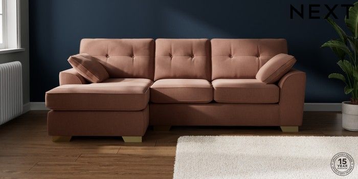 7.2.10 Buy Stamford Buttoned Back Medium Sofa Chaise - Left Hand Relaxed Linen Look Light Rust Brown Large Square Angle - Brushed Brass from the Seasons online shop Click here to use our website with more accessibility support, for example screen readers