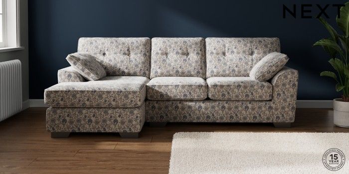 7.3.1 Buy Stamford Buttoned Back Medium Sofa Chaise - Left Hand Relaxed Linen Look Print Woodblock Floral Blue Large Square Angle - Gunmetal from the Seasons online shop Click here to use our website with more accessibility support, for example screen readers