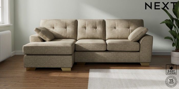 7.2.10 Buy Stamford Buttoned Back Medium Sofa Chaise - Left Hand Woven Chenille Easy Clean Mid Natural Large Square Angle - Brushed Brass from the Seasons online shop Click here to use our website with more accessibility support, for example screen readers