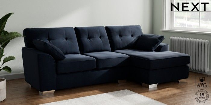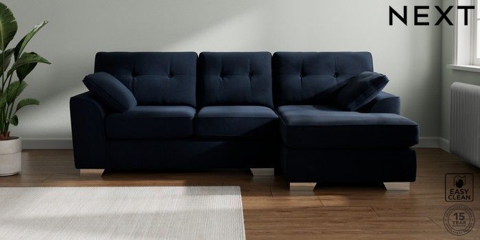7.2.10 Buy Stamford Buttoned Back Medium Sofa Chaise - Right Hand Fine Chenille Easy Clean Dark Navy Blue Large Square Angle - Chrome Metal from the Seasons online shop Click here to use our website with more accessibility support, for example screen readers