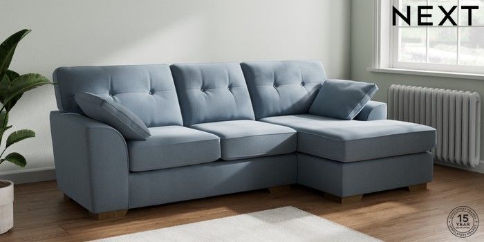 7.2.10 Buy Stamford Buttoned Back Medium Sofa Chaise - Right Hand Relaxed Linen Look Mid Blue Large Square Angle - Mid from the Seasons online shop Click here to use our website with more accessibility support, for example screen readers