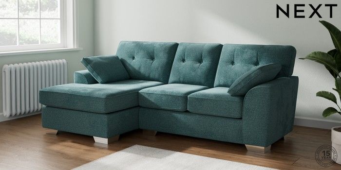 7.3.1 Buy Stamford Buttoned Back Small Sofa Chaise - Left Hand Chunky Chenille Mid Teal Green Large Square Angle - Chrome Metal from the Seasons online shop Click here to use our website with more accessibility support, for example screen readers
