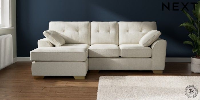 7.2.10 Buy Stamford Buttoned Back Small Sofa Chaise - Left Hand Chunky Texture Oyster Large Square Angle - Brushed Brass from the Seasons online shop Click here to use our website with more accessibility support, for example screen readers