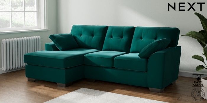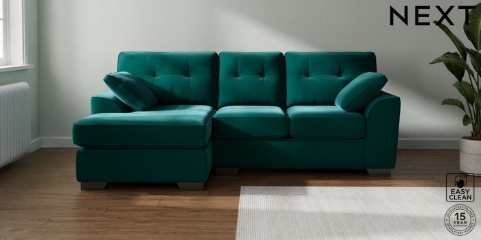 7.3.1 Buy Stamford Buttoned Back Small Sofa Chaise - Left Hand Plush Velvet Easy Clean Juniper Green Large Square Angle - Gunmetal from the Seasons online shop Click here to use our website with more accessibility support, for example screen readers