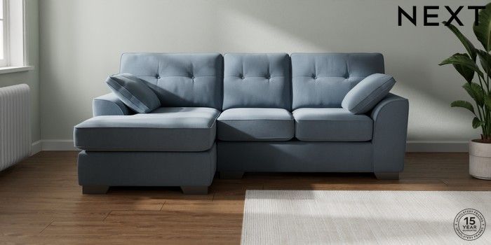 7.3.1 Buy Stamford Buttoned Back Small Sofa Chaise - Left Hand Relaxed Linen Look Mid Blue Large Square Angle - Gunmetal from the Seasons online shop Click here to use our website with more accessibility support, for example screen readers