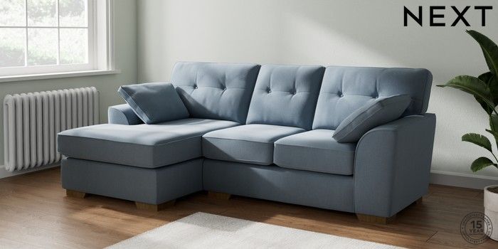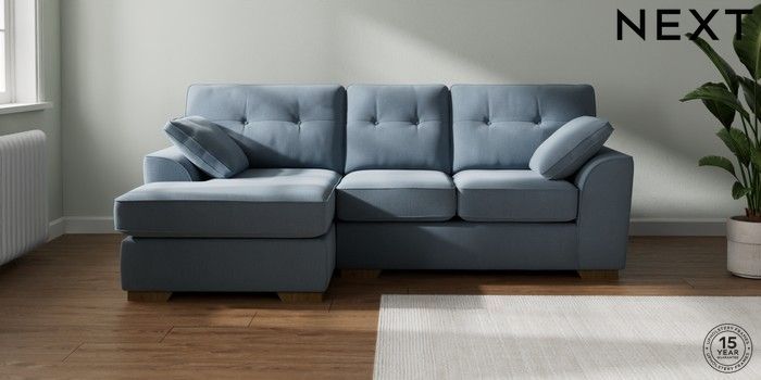 7.2.10 Buy Stamford Buttoned Back Small Sofa Chaise - Left Hand Relaxed Linen Look Mid Blue Large Square Angle - Mid from the Seasons online shop Click here to use our website with more accessibility support, for example screen readers