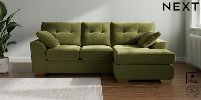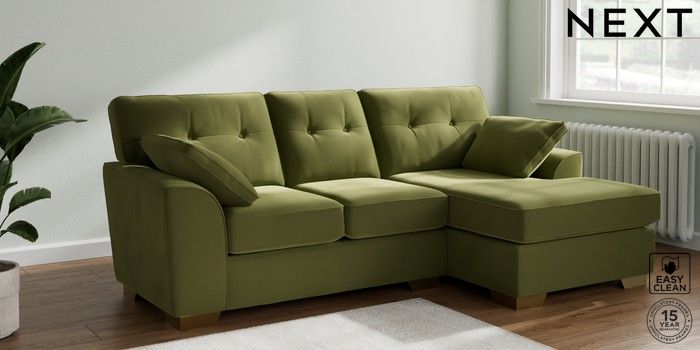 7.3.1 Buy Stamford Buttoned Back Small Sofa Chaise - Right Hand Plush Velvet Easy Clean Mid Olive Green Large Square Angle - Brushed Brass from the Seasons online shop Click here to use our website with more accessibility support, for example screen readers
